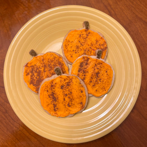 Available for a limited time, and a wonderful addition to your holiday table, these cake-y, fluffy, little pillows of pure joy are the perfect buttercream-frosted sugar cookie you never knew you needed. Slightly larger than our more traditional round ones, these cinnamon-dusted pumpkins are sure to bring a smile to your face. Please note that the minimum order for these is 6.